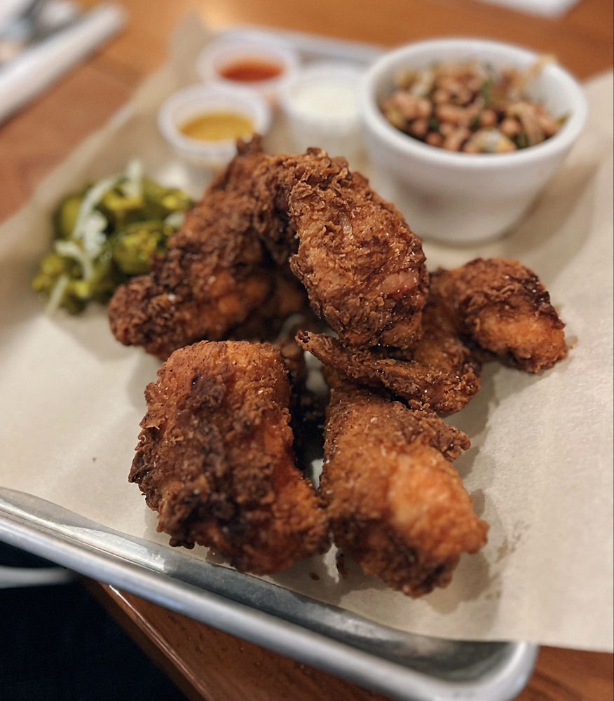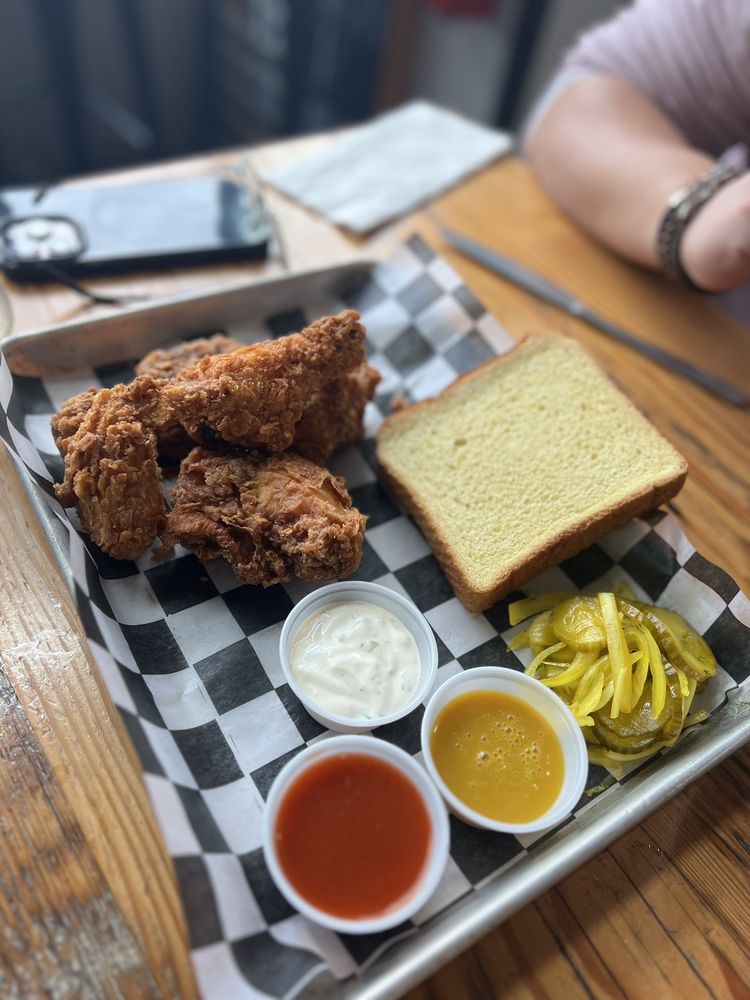 Half fried bird served with spicy pickles, ranch, hot sauce and ipa honey mustard