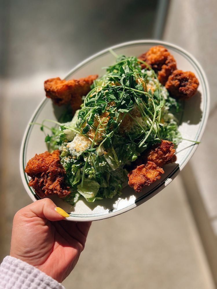 Green chilis, pickled garlic and herb aioli, chili honey hot rub + fries or a salad